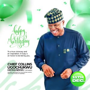 The Former Deputy Chief of Staff to the former Governor of Abia State and a Chieftain of the peoples Democratic party (PDP) Chief Barrister Olugu Kalu Ugba popularly known as Isi Bu Mba has felicitated with the member representing the good people of Isiala Ngwa North state Constituency at the Abia State house of Assembly, Hon. Iheonunekwu Collins Ugochukwu on the occasion of his birthday celebration, today, 11th December 2024.