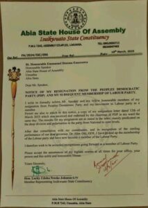 Member representing Isuikwuato State Constituency, Hon. Lucky Johnson resigns from the PDP, joins the Labour Party.