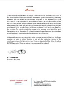 The Company further affirmed that at no time did the Directors of Enyimba Automated Shoe Company (ENASCO) deny the shares allotted to the Government. “This has been a discuss between the Government and the Directors. While the Government representatives have asked and/or requested for more shares the Directors have always advised on the need for private participation to be higher than that of the Government in the Company