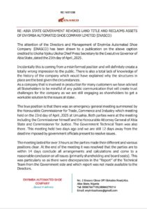 The Directors and Management of Enyimba Automated Shoe Company, (ENASCO) has described as hasty and a gross misinformation, the announcement that Abia State Government has revoked it’s land title and reclaimed assets belonging to ENASCO.