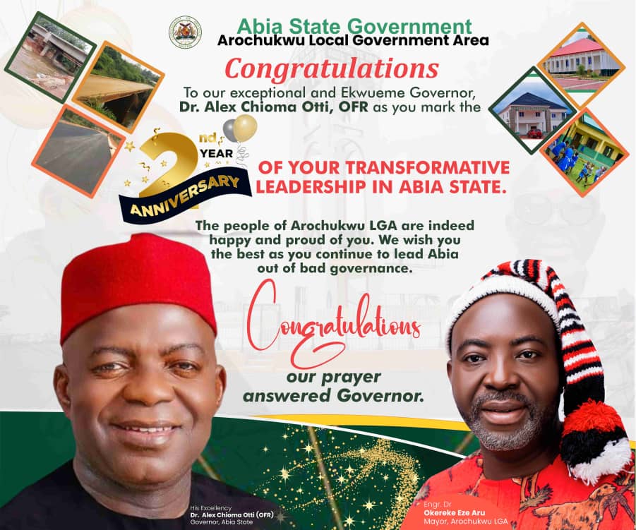 The Mayor of Arochukwu Local Government Area, Engr. Dr. Chibuike Okereke Eze Aru has on behalf of his wife, government and good people of Arochukwu LGA Felicitate with the Executive Governor of Abia State, His Excellency Dr Alex Otti on the occasion of his two years of people oriented administration.