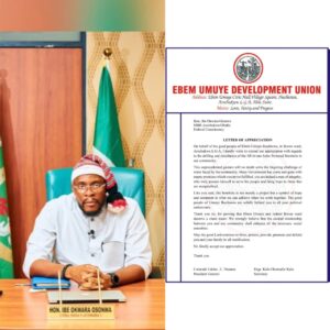 “We are solidly behind you in all your political endeavours,” the letter continued, adding that the borehole serves as evidence that the people of Ebem Umuye and Ikwun Ward deserve clean, accessible water.