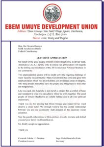 In a heartfelt letter of appreciation signed by Comrade Udoka C. Nnanna, President General of Ebem Umuye Development Union, and Engr. Kalu Okoroafor Kalu, Secretary, the community described the project as a “symbol of hope” that has addressed the long-standing water scarcity in the area.