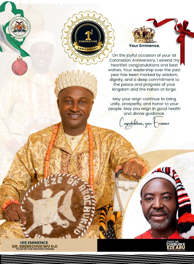 The Executive Mayor of Arochukwu Local Government Area, Engr. Dr. Chibuike Okereke Eze Aru has on behalf of the government and good people of Arochukwu LGA felicitated with His Eminence, Dr. Eberechukwu Orji, the Eze Aro of Arochukwu Kingdom on the joyful occasion of the 1st anniversary of his accession to the throne of Arochukwu Kingdom.