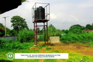 The Mayor further added that he had embarked on providing water to the rural communities with 10 Solar boreholes at various locations: Ward 1 – Umuosonyike; Ward 2 – Mbubo, opposite Obogu hall; ward 3 – Umuati Primary School; ward 4, Umungasi Village Hall Osusu; Ward 5 – umuoiyiukwu village Hall Umuchima; Ward 6 – Umuomai Village Hall; Ward 7 – Umuoke Eziama Ntigha; Ward 8 – Imerem Village Hall; Ward 9 – St David Urratta and Ward 10 – Umulenwa Village