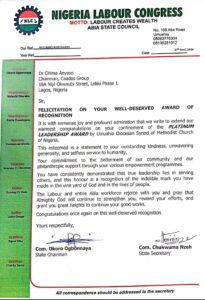The Nigeria Labour Congress (NLC), Abia State Council, has congratulated Dr. Chimaobi Desmond Anyaso (Ofuji) on the conferment of the Platinum Leadership Award by the Umuahia Diocesan Synod of the Methodist Church Nigeria.